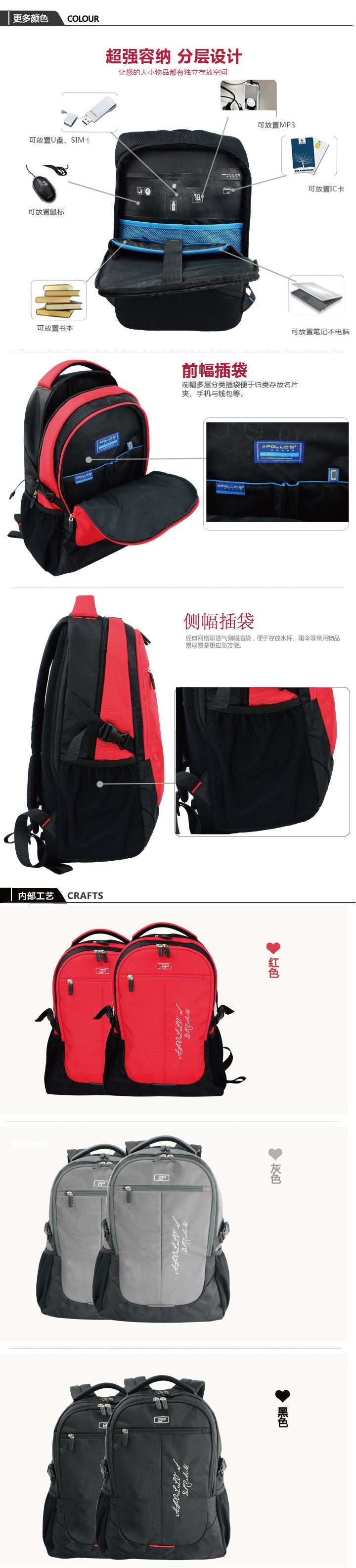 - 包内部结构:电脑隔层袋、主袋、笔插袋