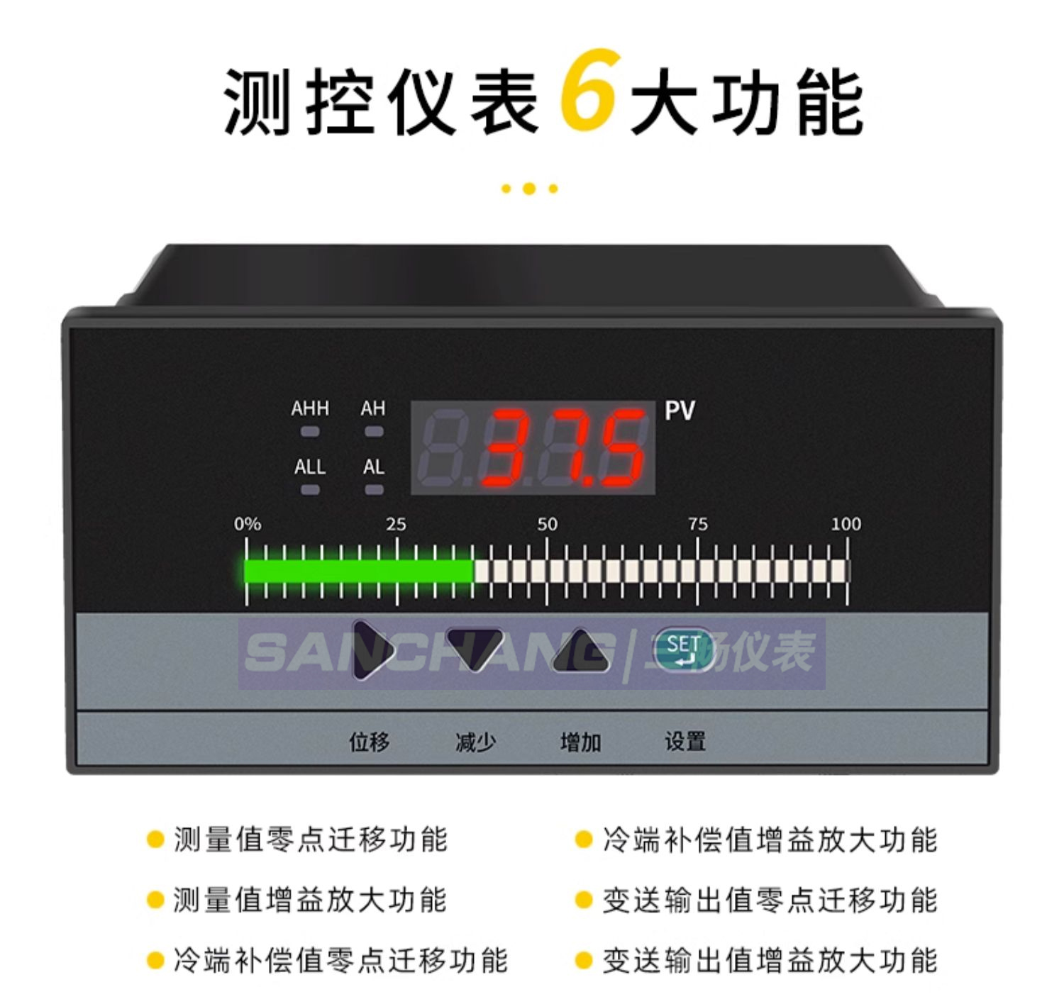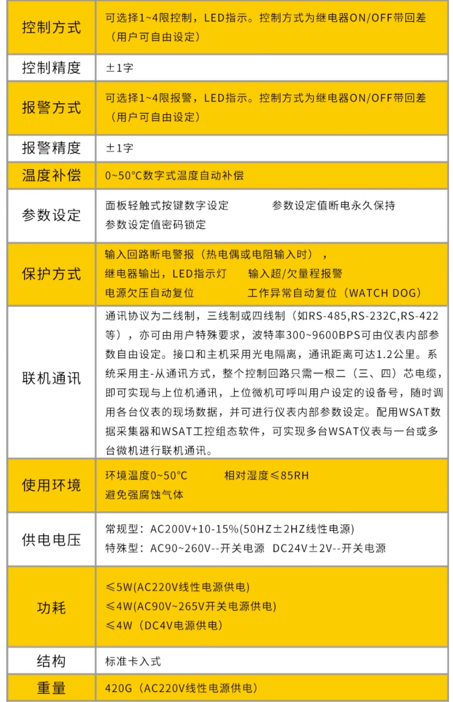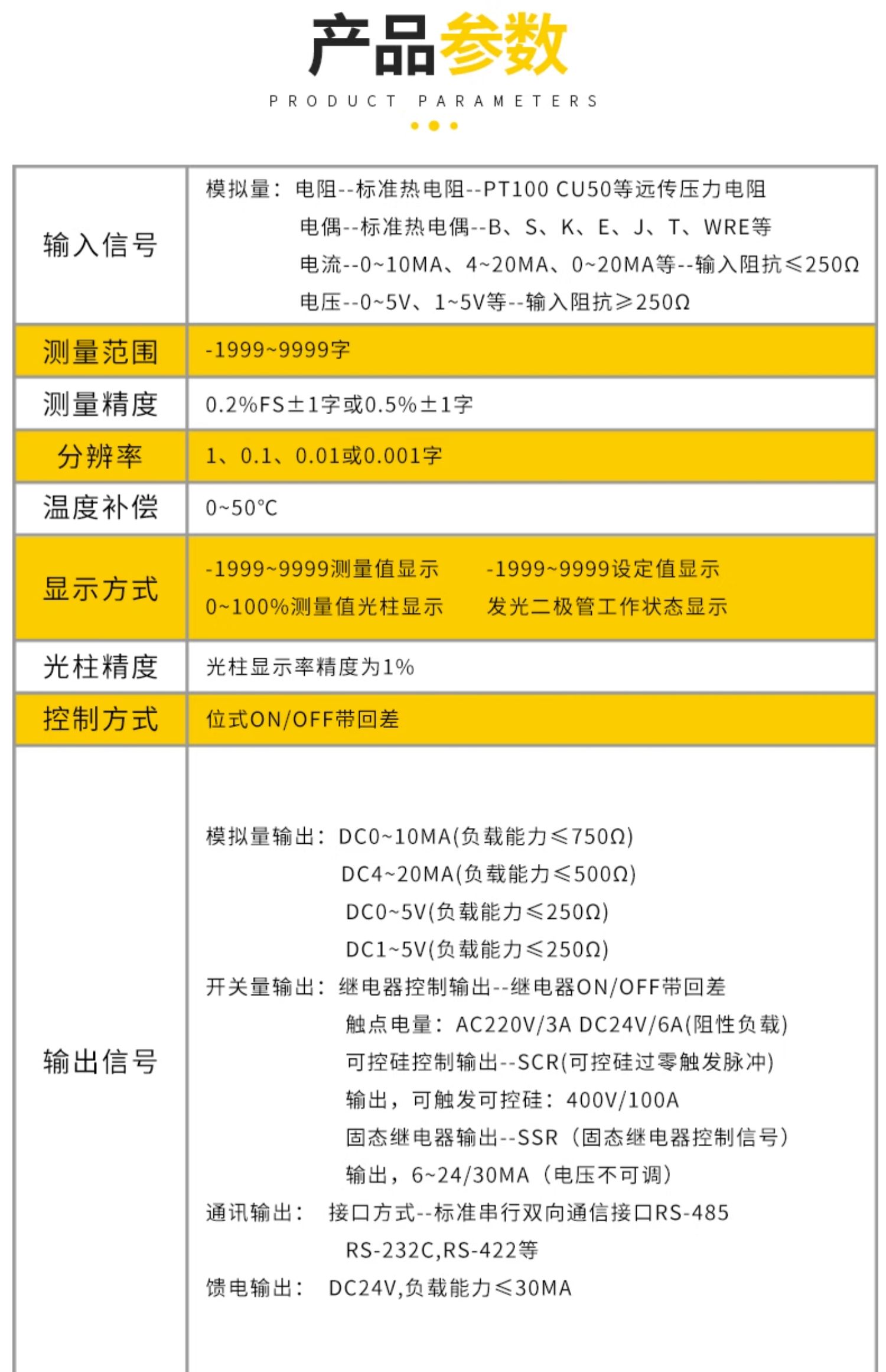 - 信号输入:用户任意选择。(热电偶,热电阻,电压,电流,线 性电阻,频率)