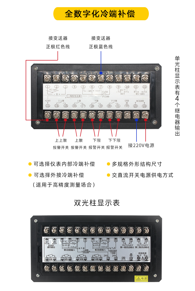 - 供电电源:开关85~260VAC或18~36VDC